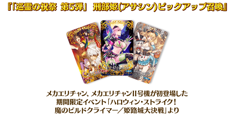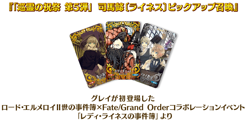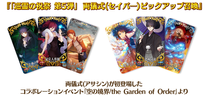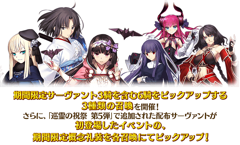 「巡霊の祝祭 第5弾」で追加された配布サーヴァント4騎と関連するサーヴァントの中から、期間限定サーヴァント3騎を含む6騎をピックアップする3種類の召喚を開催いたします!