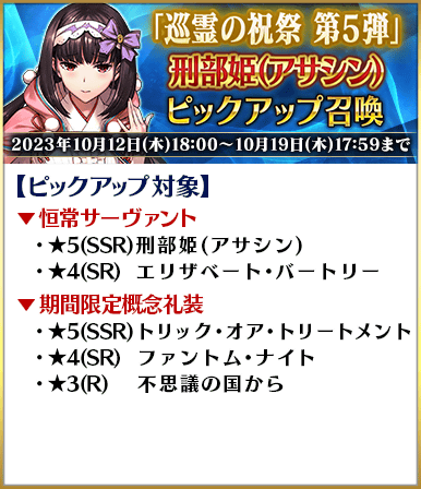 ※上記の「★5(SSR)刑部姫(アサシン)」のイラストは霊基再臨第2段階のものです。