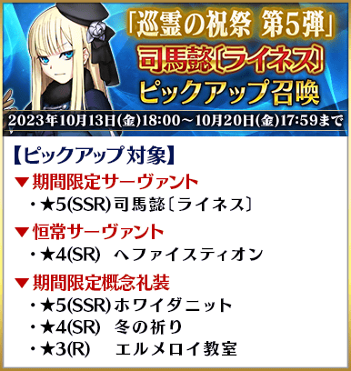 ・期間限定ピックアップ召喚において、329回以内にピックアップ対象の★5(SSR)サーヴァントが召喚されなかった場合、330回目の召喚をおこなった際に1度だけピックアップ対象の★5(SSR)サーヴァントを必ず1騎「確定召喚」できます。
