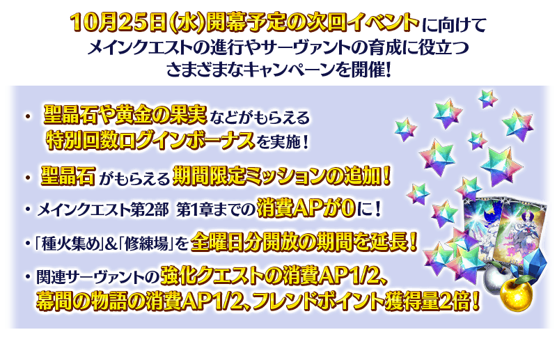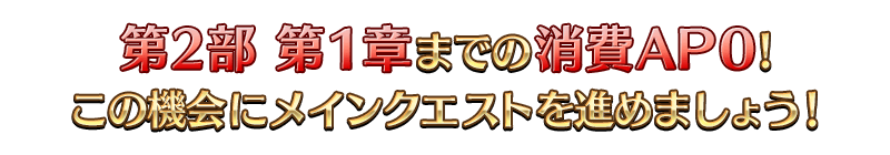 ※亜種特異点(ⅠからⅣまで)、メイン・インタールードは対象外となりますのでご注意ください。 ※現在、永続的にメインクエスト第2部 第7章までの消費APが1/2になる状態となっています。そのため、キャンペーン終了後、当該メインクエストの消費APは1/2になります。 ※現在、「オーディール・コール:新任務開放キャンペーン 第3弾」にて第2部 第7章までの消費APが1/4になる状態となっています。そのため、上記キャンペーン期間中となる2023年10月25日(水) 12:59までは第2部 第2章から第7章までの消費APは1/4になります。