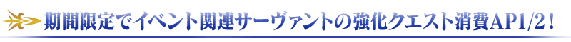 下記の期間中、期間限定イベント「聖杯戦線 ~白天の城、黒夜の城~」関連サーヴァントの強化クエストの消費APが1/2になります!(バトルにおいて撤退した場合でも、同様の消費量になります)