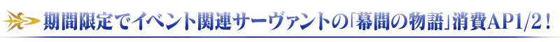 下記の期間中、期間限定イベント「聖杯戦線 ~白天の城、黒夜の城~」関連サーヴァントの「幕間の物語」の消費APが1/2になります!(バトルにおいて撤退した場合でも、同様の消費量になります)