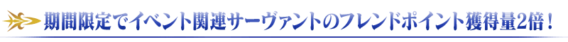 ※フレンドではないマスターもフレンドポイント獲得量2倍の対象となります。 ※ゲストサーヴァントの場合はフレンドポイント獲得量2倍の対象外となりますのでご注意ください。