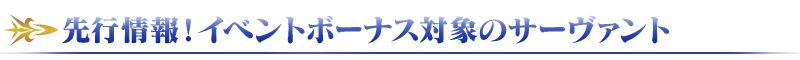 ※対象のサーヴァントとなっていても、本イベントのメインシナリオに登場しない場合があります。 ※10月18日(水) 18:00より、サーヴァント選択画面やサーヴァント強化画面などに、イベントボーナスフィルターが追加されております。イベントで活躍するサーヴァントのみを表示する便利な機能となりますので、こちらもあわせてご活用ください。 ※イベント開催に合わせて、一部イベントボーナスの対象サーヴァントを追加しました。
