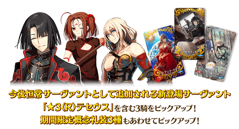 期間限定イベント「聖杯戦線 ~白天の城、黒夜の城~」の開幕を記念して、今後恒常サーヴァントとして追加される新登場サーヴァント「★3(R)テセウス」を含むサーヴァント3騎と、期間限定概念礼装3種をピックアップ! ※イベント参加条件を満たしていない状態でも本召喚をおこなえます。
