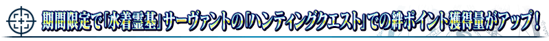 下記の期間中、下表のサーヴァントはすべての「ハンティングクエスト」において、「絆ポイント獲得量がアップ」のボーナスが得られます!