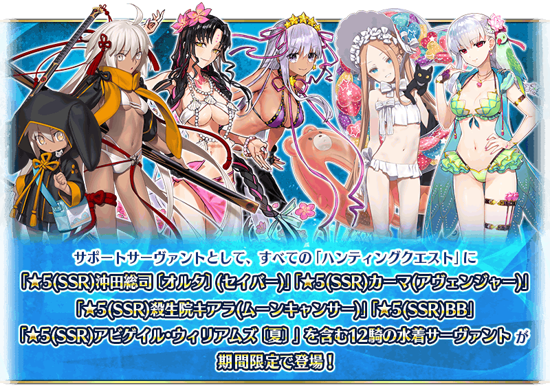 下記の期間中、期間限定で「ハンティングクエスト」にサポートサーヴァントとして「★5(SSR)沖田総司〔オルタ〕(セイバー)」「★5(SSR)カーマ(アヴェンジャー)」「★5(SSR)殺生院キアラ(ムーンキャンサー)」「★5(SSR)BB」「★5(SSR)アビゲイル・ウィリアムズ〔夏〕」を含む12騎の水着サーヴァントが登場します!