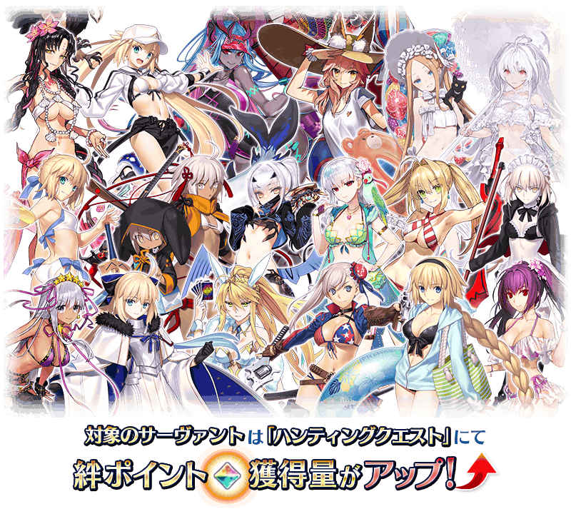 下記の期間中、下表のサーヴァントはすべての「ハンティングクエスト」において、「絆ポイント獲得量がアップ」のボーナスが得られます!