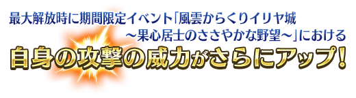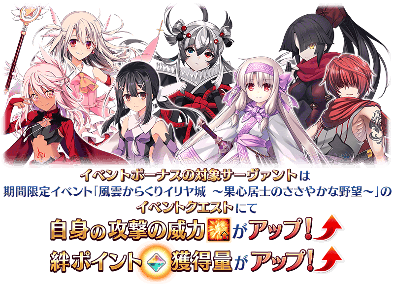 本イベントの期間中、下表のサーヴァントはイベントクエストにおける「自身の攻撃の威力がアップ」と「絆ポイント獲得量がアップ」のボーナスを得られます!