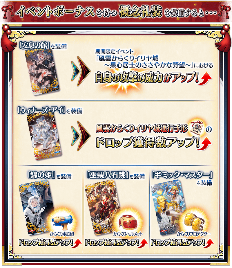 さらに、聖晶石召喚にてピックアップされる期間限定概念礼装「★5(SSR)錦の姫」「★4(SR)巫覡八石跳」「★3(R)ギミック・マスター」を装備することで、イベントアイテム「からくり水鉄砲」「からくりヘルメット」「からくりプロテクター」それぞれのドロップ獲得数がアップします。