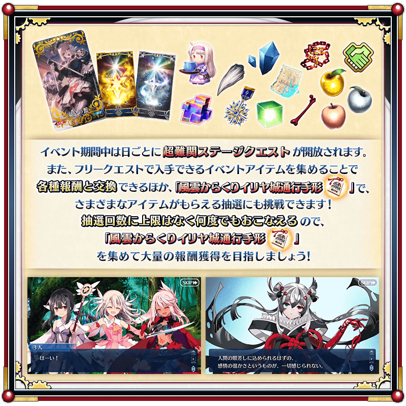 期間限定イベント「風雲からくりイリヤ城 ~果心居士のささやかな野望~」では、フリークエストをクリアした際に入手できるイベントアイテムを各種報酬と交換できるほか、「風雲からくりイリヤ城通行手形」を集めるとさまざまなアイテムがもらえる抽選に挑戦できます。