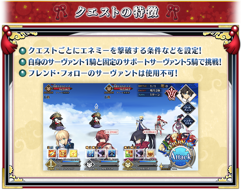 「チャレンジクエスト」はクリア後も消滅せず、サーヴァントや概念礼装の組み合わせを変更するなどして、何度でも挑戦できます。 ※クエストクリア報酬、戦利品、マスターEXP、魔術礼装EXP、絆ポイントを獲得できるのは初回クリア時のみです。