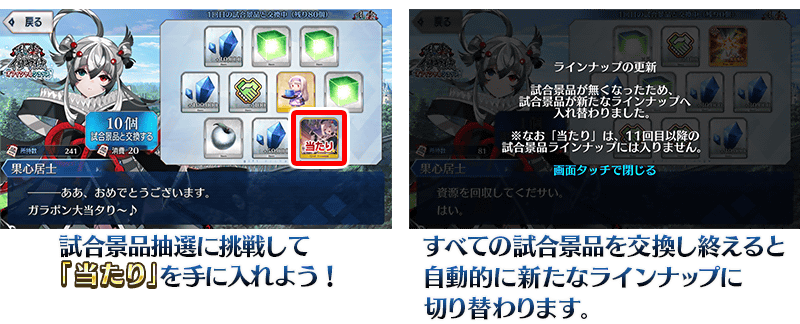 また、抽選を受けている試合景品をすべて交換し終えると、自動的に次のラインナップに切り替わります。