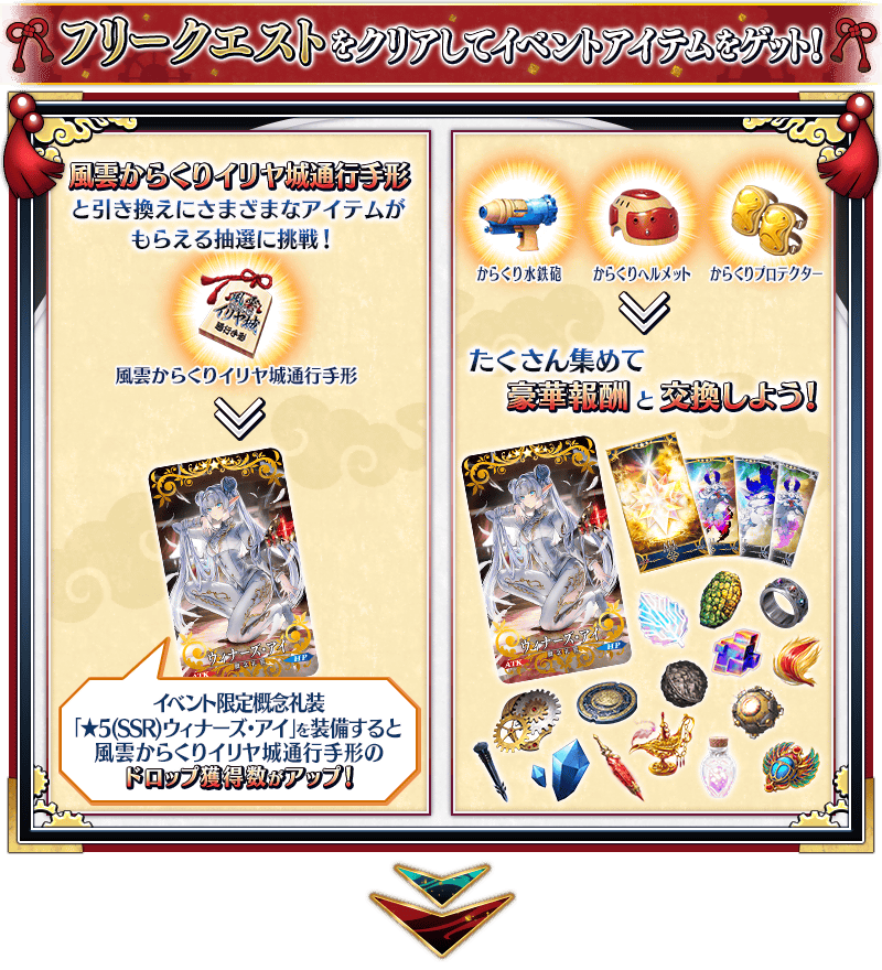また、イベントアイテム交換で入手できるイベント限定概念礼装「★5(SSR)ウィナーズ・アイ」を装備することでイベントアイテム「風雲からくりイリヤ城通行手形」のドロップ獲得数がアップ!
