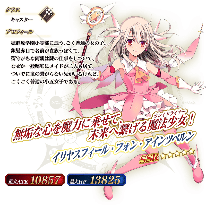 ※上記の「★5(SSR)イリヤスフィール・フォン・アインツベルン(キャスター)」のイラストは霊基再臨第2段階のものです。