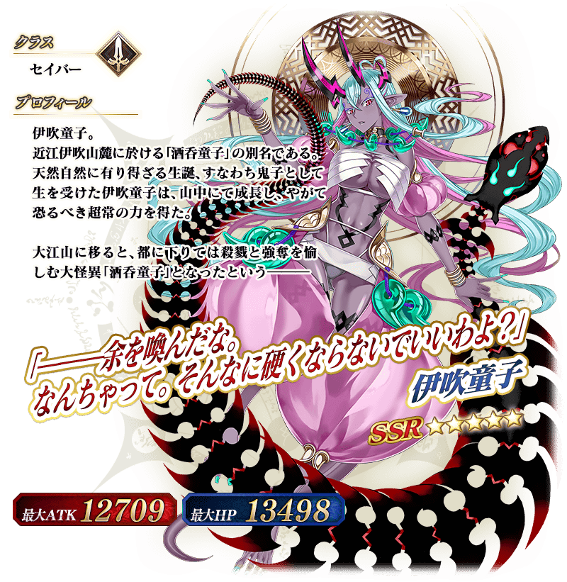 ※上記の「★5(SSR)伊吹童子(セイバー)」のイラストは霊基再臨第3段階のものです。