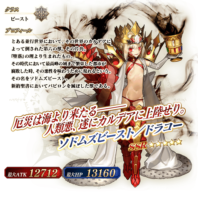 ※「★5(SSR)ソドムズビースト/ドラコー」は、期間限定Fate/Grand Order Arcade×Fate/Grand Orderコラボレーションイベント「螺旋証明世界 リリムハーロット ~喝采なき薔薇~」の特定のメインクエストをクリアすることで、霊基再臨第3段階時の宝具演出とBGMが変化いたします。