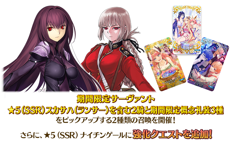 期間限定Fate/Grand Order Arcade×Fate/Grand Orderコラボレーションイベント「螺旋証明世界 リリムハーロット ~喝采なき薔薇~」に関連するサーヴァントの中から、期間限定サーヴァント「★5(SSR)スカサハ(ランサー)」を含む2騎のサーヴァントと期間限定概念礼装3種をピックアップする2種類の召喚を開催いたします!