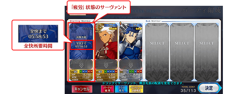 サーヴァントの「疲労」状態は時間が経過することで回復します。アイテムや令呪などによる回復はおこなえませんのでご注意ください。