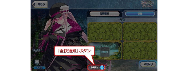 「全快通知」をONにした状態で、休憩所にサーヴァントを設定してアプリを終了すると、休憩所に設定したサーヴァント全員が全快した際に、プッシュ通知が届くようになります。