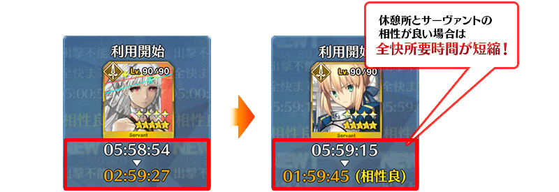 また、各休憩所にはサーヴァントとの相性があり、相性が良いサーヴァントを設定した場合、回復速度がさらに速まります。