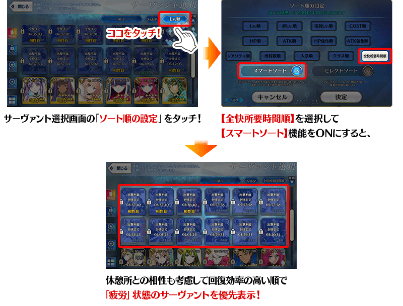 また、疲労回復をおこなうために各休憩所を利用する際に、「全快所要時間順」を選択して「スマートソート」機能をONにすると、休憩所との相性も考慮して回復効率の高い順で「疲労」状態のサーヴァントを優先表示させることができます。