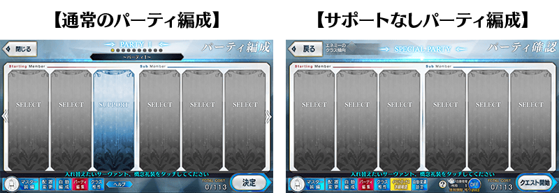 期間限定イベント「ミスティックアイズ・シンフォニー ~妖しの森と麗しの足跡~」では、一部のクエストを除き通常のパーティ編成とは異なり、パーティのメンバーとしてサポートサーヴァントを選択することができません。