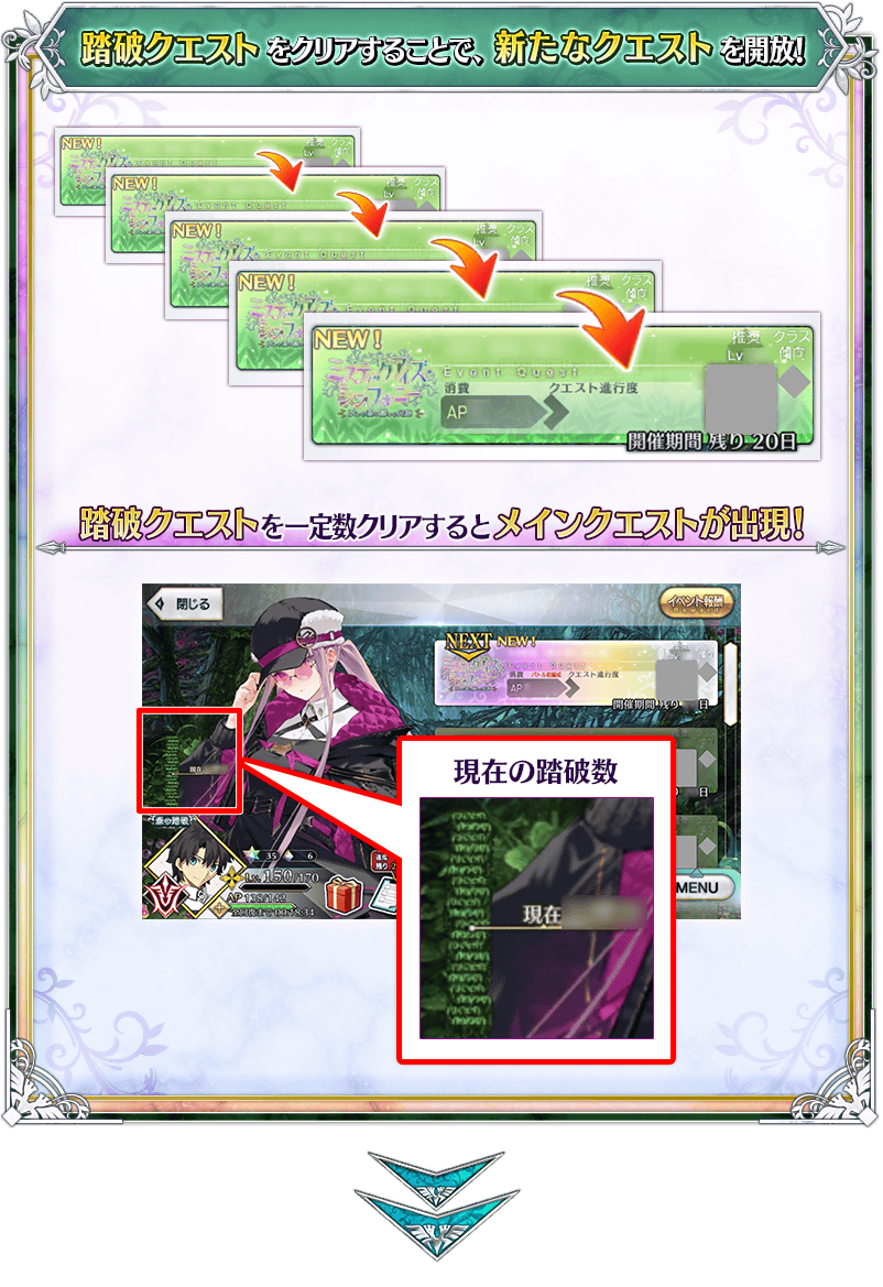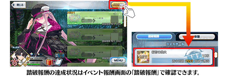 期間限定イベント「ミスティックアイズ・シンフォニー ~妖しの森と麗しの足跡~」では、踏破クエストを一定数クリアするごとに、踏破報酬を受け取れます。
