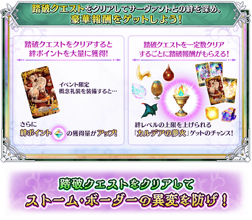 踏破報酬で入手できるイベント限定概念礼装「★5(SSR)匠たる心魂」を装備することで、期間限定イベント「ミスティックアイズ・シンフォニー ~妖しの森と麗しの足跡~」における絆ポイントの獲得量がアップします。