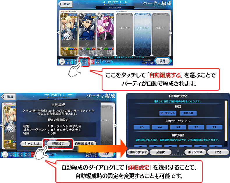 クエスト内容にあわせクラス相性を考慮した自動編成のほか、レアリティや編成騎数など細かに設定を加えて自動編成することも可能です。