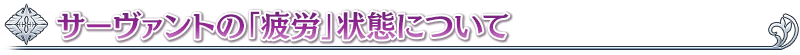 ※バトル勝利時のみ「疲労」状態となり、敗北または撤退した場合は「疲労」状態にはなりません。 ※同じサーヴァントを複数騎所持している場合は、出撃していない同サーヴァントも出撃できなくなります。(再臨段階が異なる場合でも同様に「疲労」状態となります。) ※「疲労」状態が適用されるのは、期間限定イベント「ミスティックアイズ・シンフォニー ~妖しの森と麗しの足跡~」内のみとなり、通常のメインクエストや強化クエストなど恒常のクエストは対象外となります。