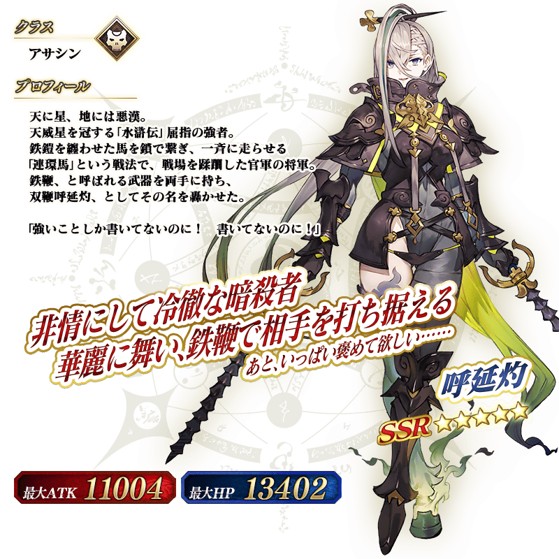 本召喚にてピックアップされている、「★5(SSR)呼延灼」の宝具演出を紹介いたします!