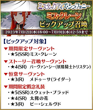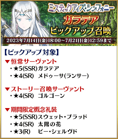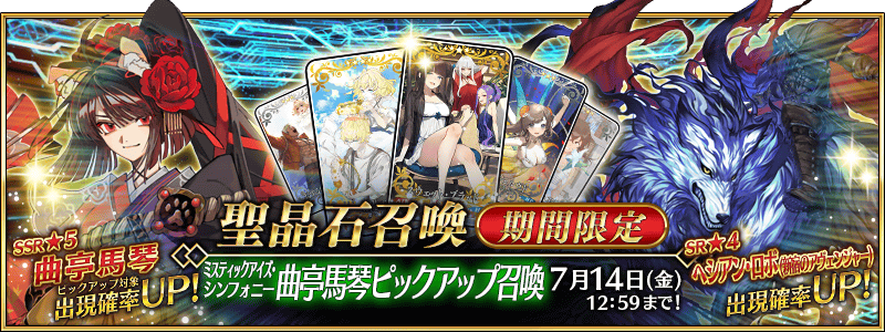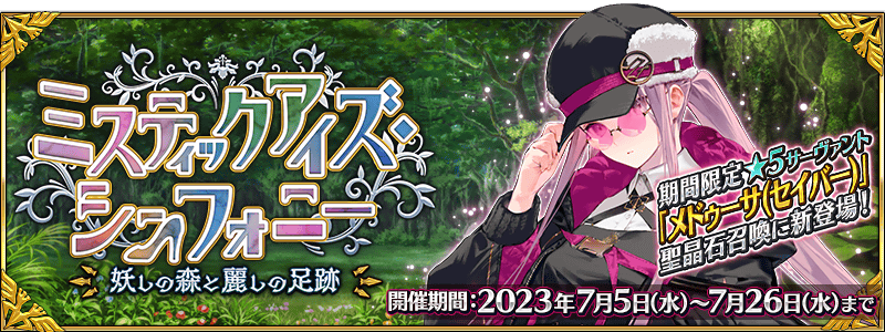 期間限定イベント「ミスティックアイズ・シンフォニー ~妖しの森と麗しの足跡~」の開幕を記念して、期間限定サーヴァント1騎を含む9騎のサーヴァントと期間限定概念礼装3種をピックアップする3種類の召喚を開催! ※イベント参加条件を満たしていない状態でも本召喚をおこなえます。