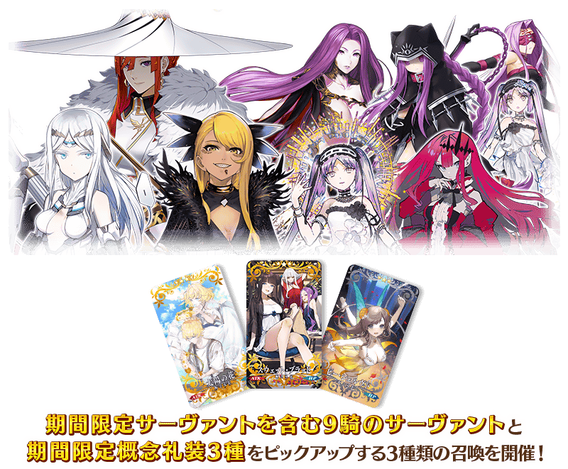 ※下記の期間限定サーヴァントは、ピックアップ対象となっている召喚からのみ排出されます。また、ピックアップ期間終了後、ストーリー召喚には追加されません。