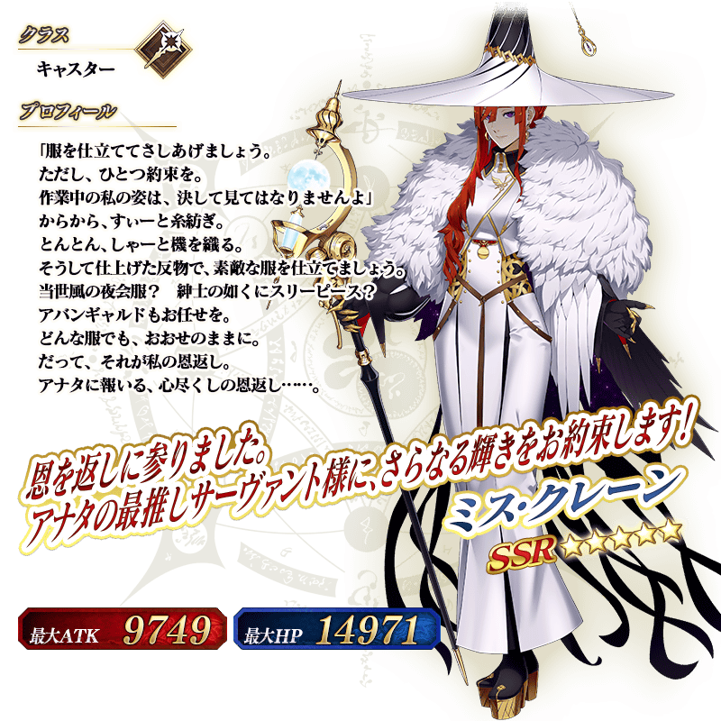 ※上記の「★5(SSR)ミス・クレーン」のセイントグラフは霊基再臨第2段階のものです。