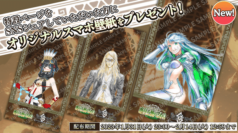 ※2023年1月31日(火) 23:00~2月14日(火) 12:59までの期間中、最初にアプリを起動した際に第2部 第7章「Lostbelt No.7 黄金樹海紀行 ナウイ・ミクトラン 惑星を統べるもの」(後編)のCMムービーが再生されます。 ※期間中、第2部 第7章「Lostbelt No.7 黄金樹海紀行 ナウイ・ミクトラン 惑星を統べるもの」(後編)のCMムービーはマイルームのマテリアル(ストーリー)に登録され、期間終了後に削除されます。