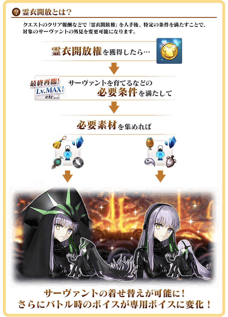 ※「霊衣開放」後は自動でバトルキャラやフェイス画像が切り替わります。「霊衣開放」前の状態に戻したい場合や、他の再臨段階に変更したい場合は、サーヴァント詳細画面より変更することができます。 ※「霊衣開放」をおこなってもクラスやパラメータなどに変化はありません。