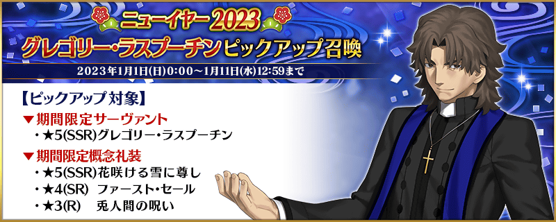 2023年を迎えたことを記念して、新登場の期間限定サーヴァント「★5(SSR)グレゴリー・ラスプーチン」と期間限定概念礼装3種をピックアップ!