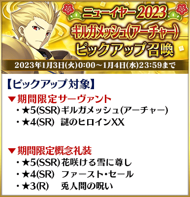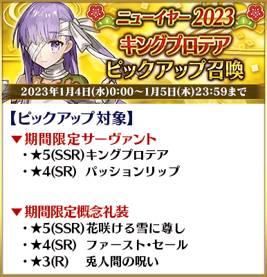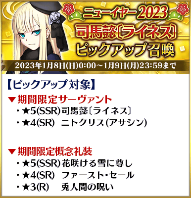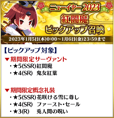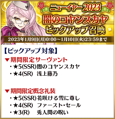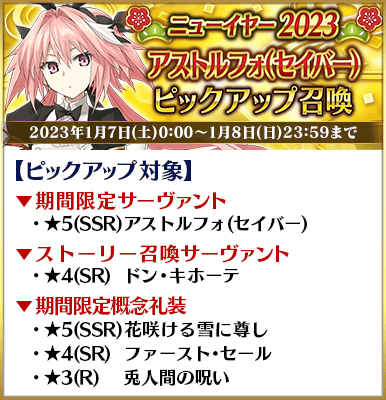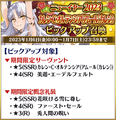 2023年1月3日(火) 0:00以降に実施されるすべての期間限定ピックアップ召喚において、「ピックアップされた★4(SR)サーヴァント」の出現確率が一部従来より上昇するよう調整をおこないます。