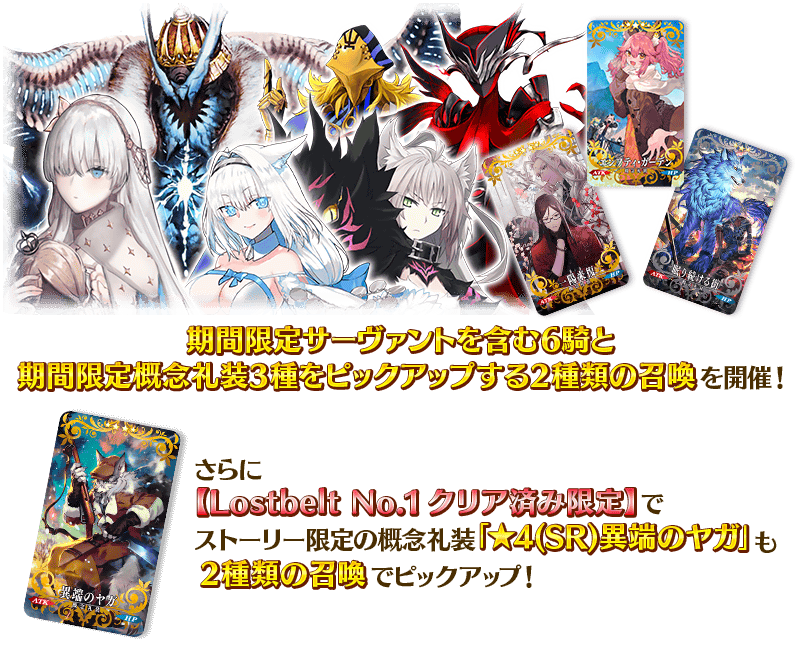※本召喚において、ストーリー限定の概念礼装「★4(SR)異端のヤガ」は第2部 第1章「Lostbelt No.1 永久凍土帝国 アナスタシア 獣国の皇女」をクリア済みの場合のみ排出され、ピックアップ対象となります。