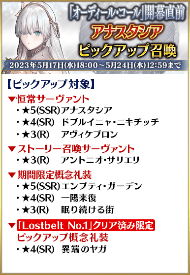 第2部 第1章「Lostbelt No.1 永久凍土帝国 アナスタシア 獣国の皇女」をクリアしていない場合はピックアップ対象外となり、本召喚では排出されませんのでご注意ください。