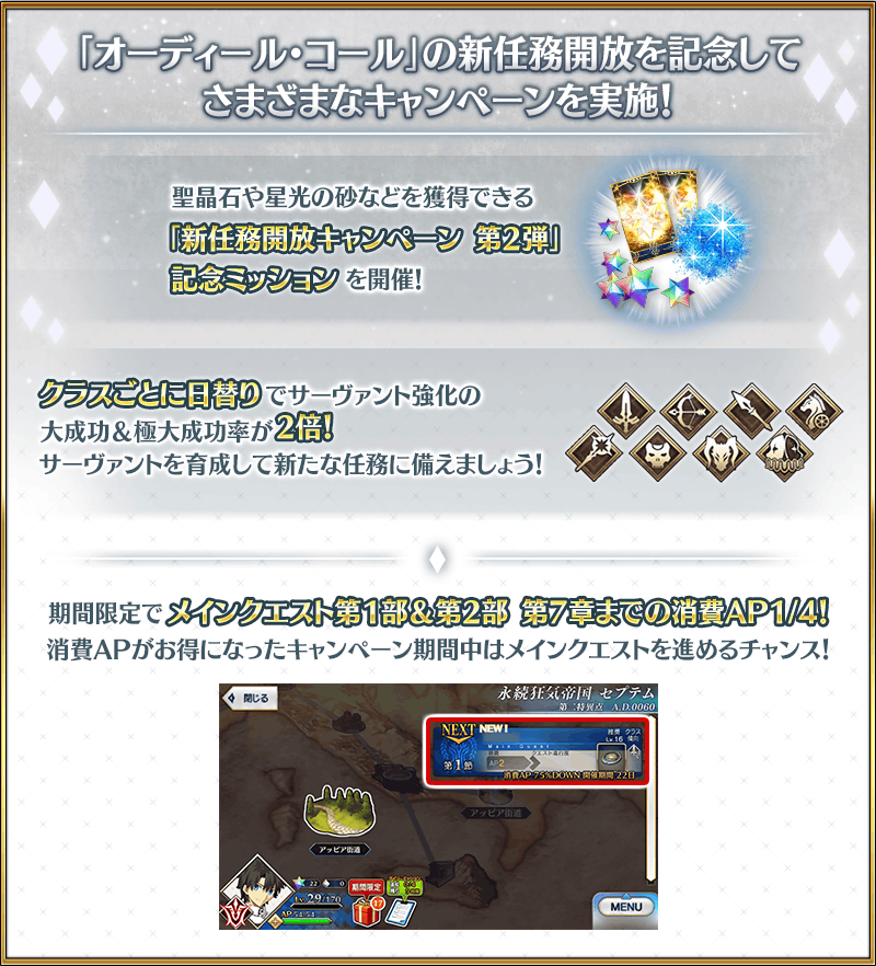 ※メインクエスト第2部 第5.5章、第2部 第6.5章、亜種特異点(ⅠからⅣまで)、メイン・インタールードは対象外となりますのでご注意ください。 ※現在、永続的にメインクエスト第2部 第7章までの消費APが1/2になる状態となっています。そのため、キャンペーン終了後、当該メインクエストの消費APは1/2になります。