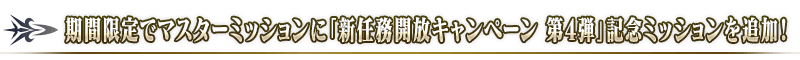 ※開催期間と受け取り期間は異なりますのでご注意ください。 ※毎週月曜0:00に更新される通常のミッション(ウィークリー)とは別枠となり、受け取り期間を過ぎると報酬は入手できませんのでご注意ください。 ※「【新任務開放キャンペーン 第4弾】ミッション」を達成しても、通常のミッション(ウィークリー)のミッション進行度にはカウントされません。 ※すでにすべてのメインクエストをクリアしている場合、ミッションは自動的に達成されます。 ※メインクエスト第2部 第5.5章、第2部 第6.5章、亜種特異点(ⅠからⅣまで)、メイン・インタールードはミッション対象外となりますので、あらかじめご注意ください。