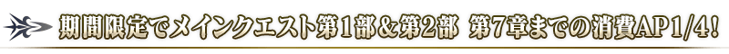 下記の期間中、メインクエスト第2部 第7章までの消費APが1/4になります!(バトルにおいて撤退した場合でも、同様の消費量になります)