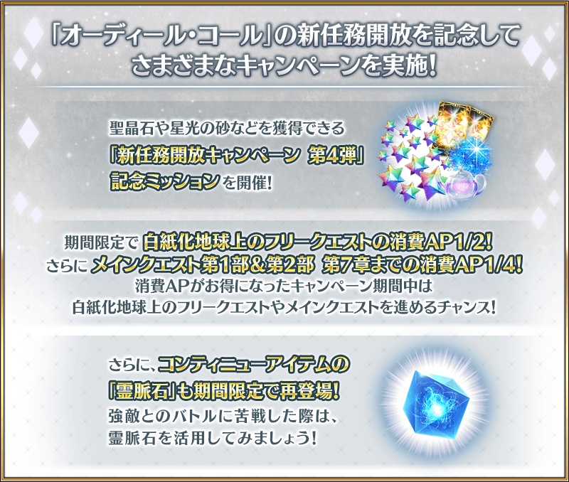 メインクエストでのバトルに敗北してしまった際、消費することでバトルに復帰することができるアイテム「霊脈石」が「オーディール・コール:新任務開放キャンペーン 第4弾」の期間限定アイテムとして再登場!