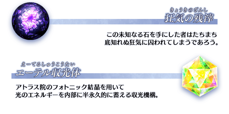 新しく登場するサーヴァントのスキル強化および霊基再臨に必要なアイテムとなります。