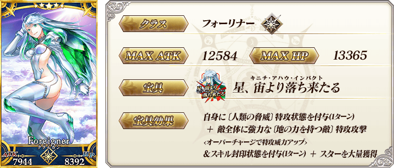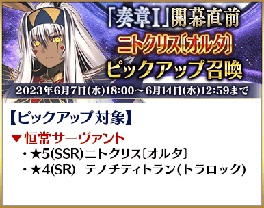 ※「★4(SR)テノチティトラン(トラロック)」は、第2部 第7章「Lostbelt No.7 黄金樹海紀行 ナウイ・ミクトラン 惑星を統べるもの」の特定のメインクエストをクリアしたうえで「トラロック」を霊基再臨第3段階にすることで、名称が「テノチティトラン」に変化します。