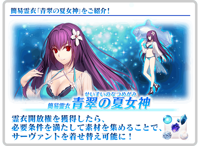 期間限定イベント「サーヴァント・サマー・フェスティバル2023!」の報酬として、「★5(SSR)スカサハ=スカディ(ルーラー)」の簡易霊衣「青翠の夏女神」の開放権が登場!