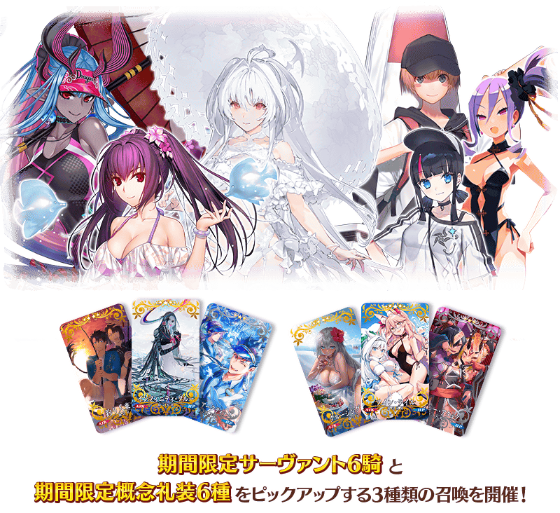 期間限定イベント「サーヴァント・サマー・フェスティバル2023!」の開幕を記念して、2022年の水着イベントで登場した期間限定サーヴァント6騎と期間限定概念礼装6種をピックアップする3種類の召喚を開催!