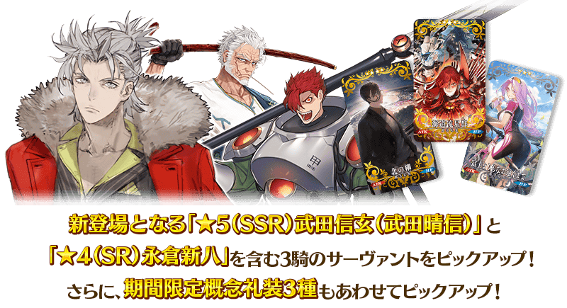 期間限定イベント「激走!川中島24時 ぐだぐだ超五稜郭 殺しのサインはM51」の開幕を記念して、新登場の期間限定サーヴァント「★5(SSR)武田信玄(武田晴信)」「★4(SR)永倉新八」を含む3騎のサーヴァントと、期間限定概念礼装3種をピックアップ!